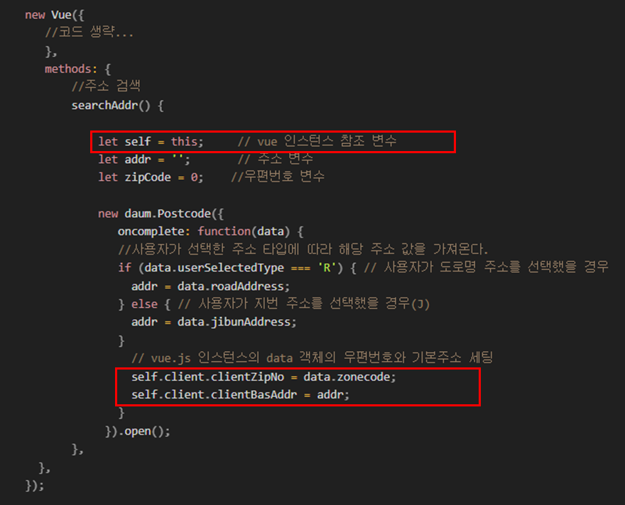 // vue.js 인스턴스의 data 객체의 우편번호와 기본주소 세팅
