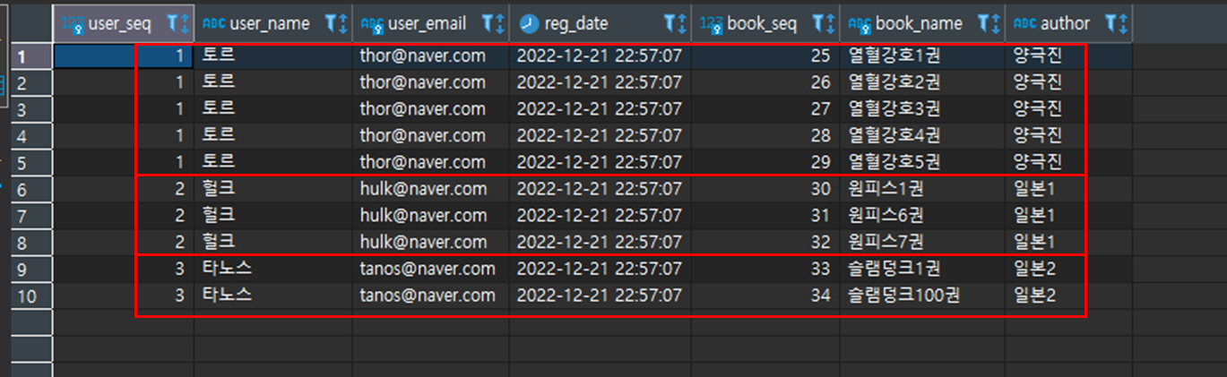 아래 DB 테이블을 보면 회원번호 1번인 천둥의 신 토르가 열혈강호 1권~5권까지 가지고 있다.