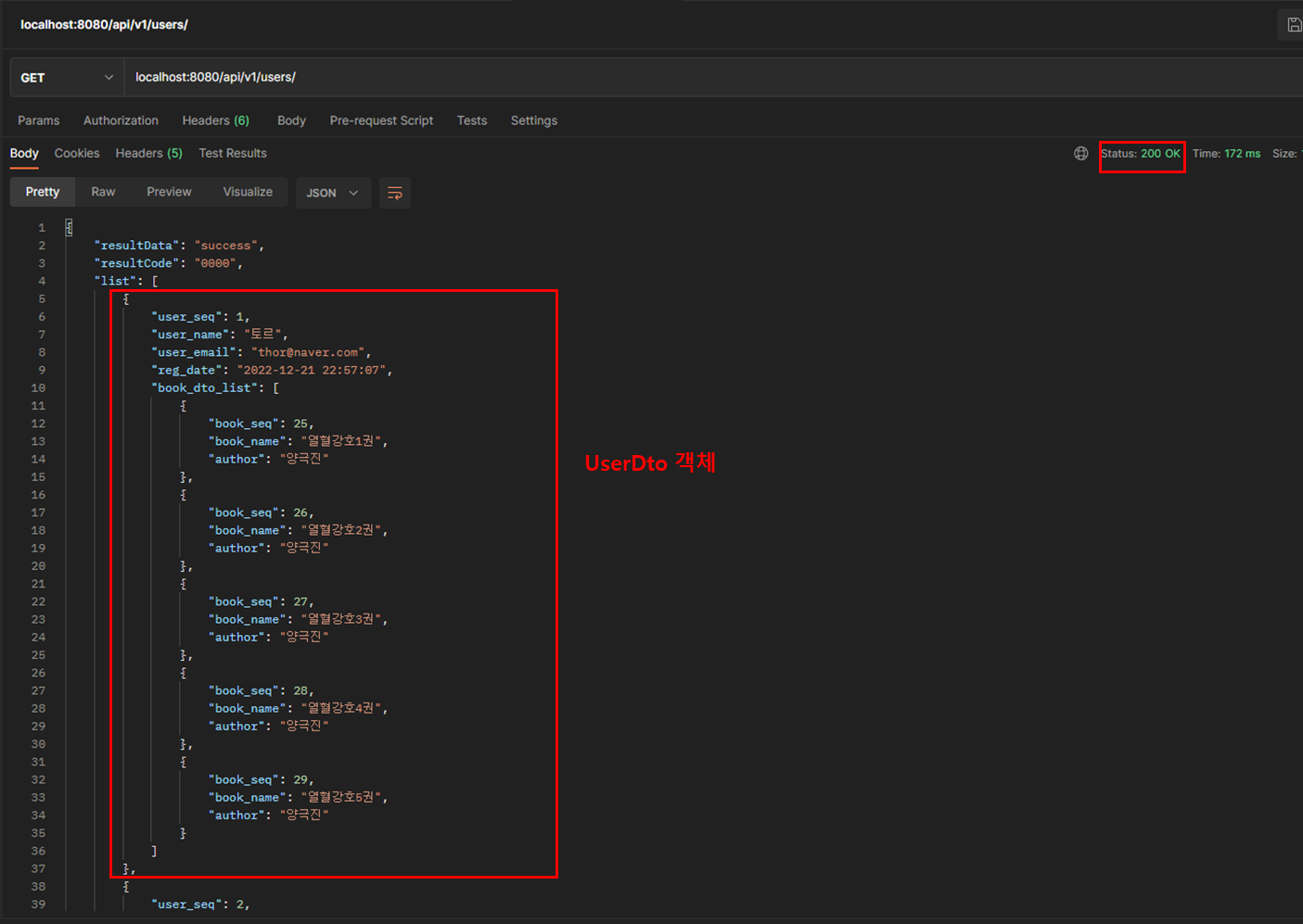 Map({})안에 list([])안에 uerDto객체({book_dto_list[]})가 담겨 있고 http 상태코드 200이 반환되었다.