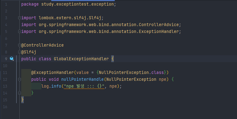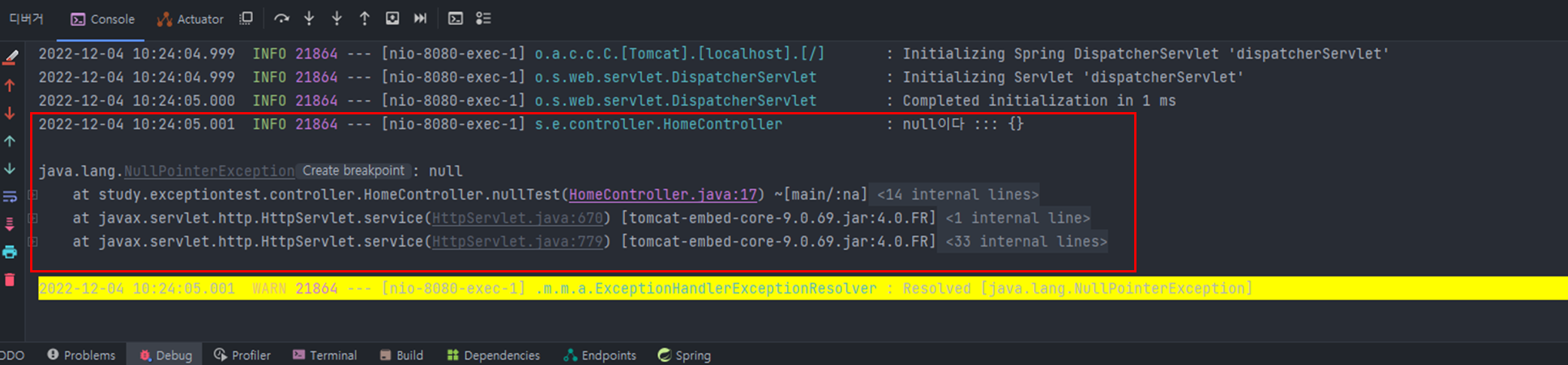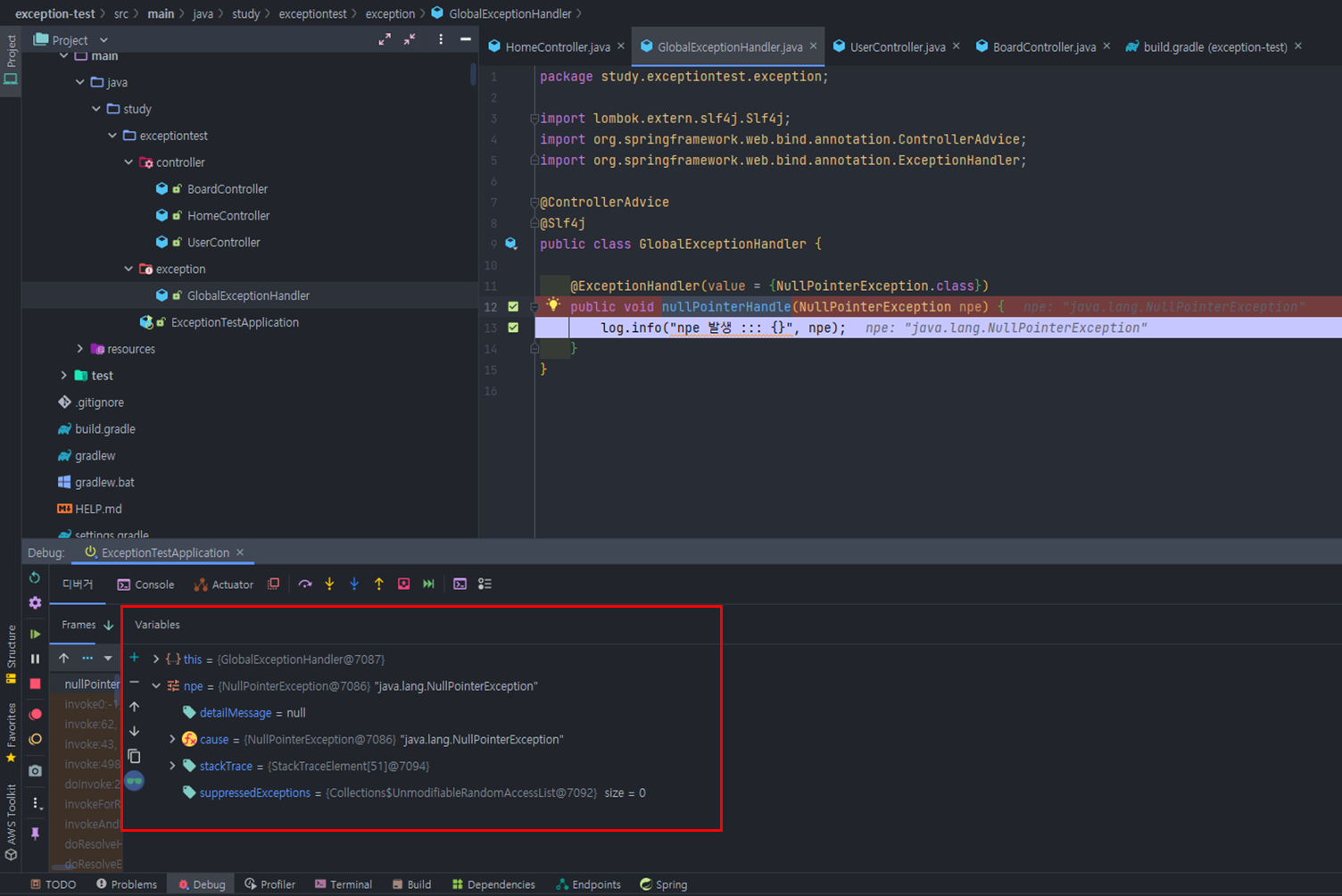 정상적으로 GlobalExceptionHandler 클래스에서 작성한 메소드로 들어와서 로그가 출력된다.브레이크 포인트를 걸어도 아래처럼 내가 만든 GlobalExceptionHandler 클래스의 nullPointerHandle 메소드에 걸린다.