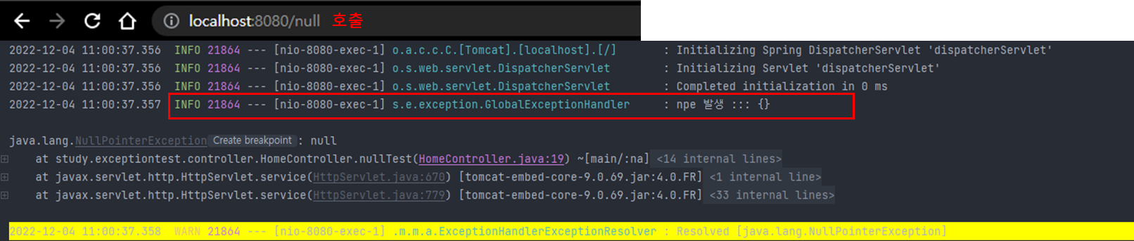 컨트롤러에 만든 nullHandle()에서 작성한 로그가 정상적으로 출력되었다.