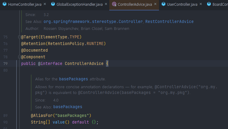 @ControllerAdvice를 따라가보면 아래처럼 컴포넌트 스캔으로 빈으로 만들고, 대상이 Type으로 되어있다.