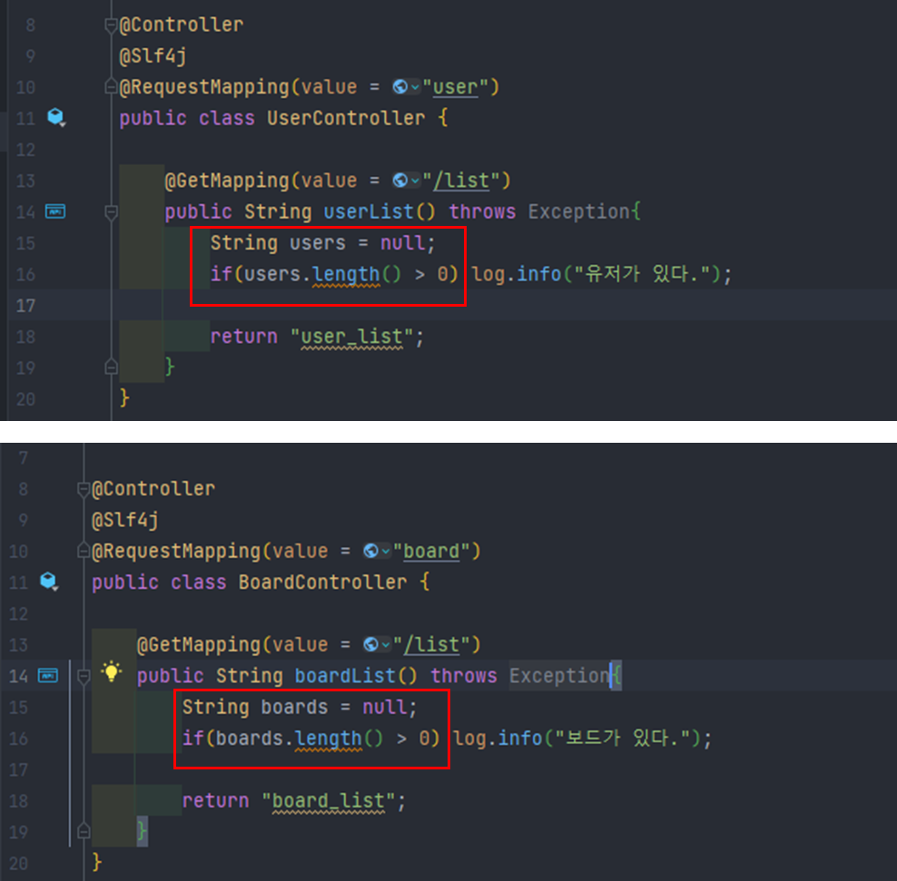 아래처럼 컨트롤러를 2개를 더 만들고 둘 다 npe를 고의로 발생 시키는 코드를 작성했다.