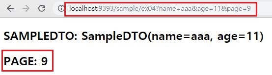 아래 이미지처럼 SampleController에서 method를 작성한 뒤 브라우저에서 parameter의 값을 추가해서 호출해 보면 dto의 값은 화면에 전달되지만, page의 값은 화면에 전달되지 않음