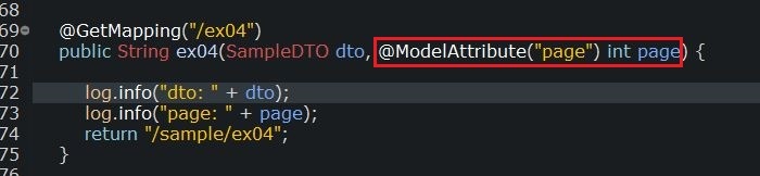 SampleController에 추가한 메서드의 parameter에 @ModelAttribute를 추가하면 아래와 같이 됨, 기본자료형에 @ModelAttribute를 적용할 경우에는 반드시 @ModelAttribute("변수명") value(int page) 이런식으로 지정해야 함