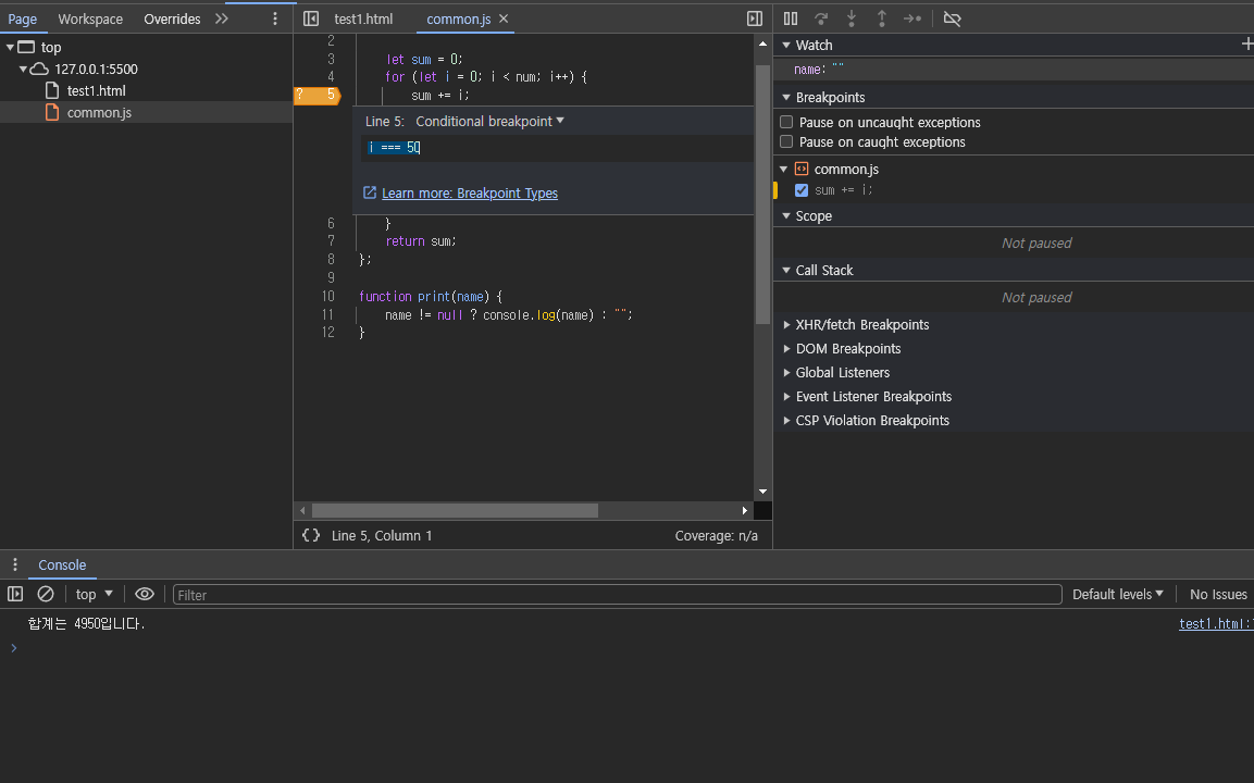 크롬 개발자 도구 조건 중단점 걸기(특정 조건일 때만 브레이크 포인트 활성화)