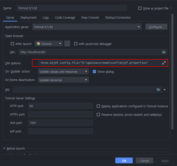 tomcat의 vm option에 웹 보안 API 모듈의 위치의 설정파일을 잡아줌