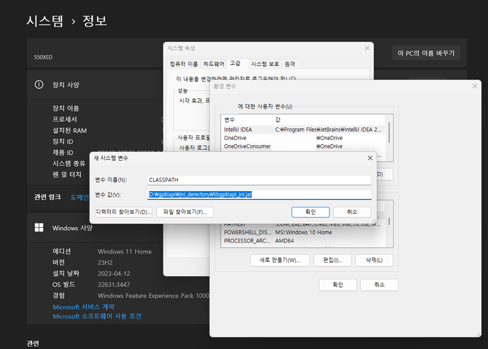 CLASSPATH라는 시스템 변수 추가 후 jar파일 경로를 설정